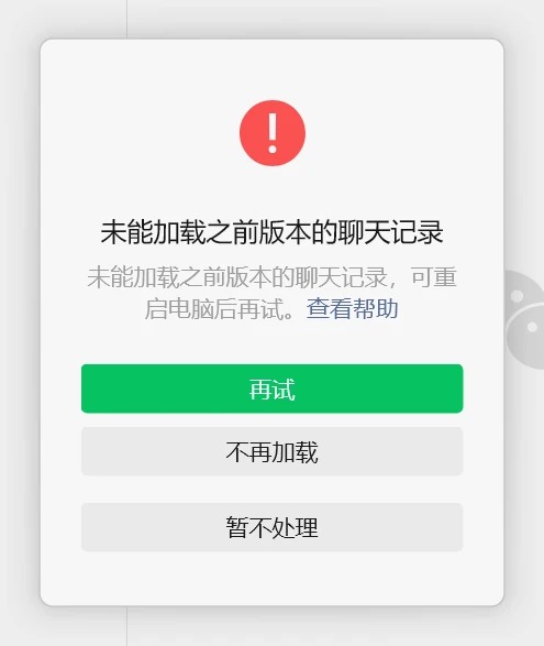 - 加载失败:启动微信后弹出红色感叹号提醒,无法同步旧的聊天数据。