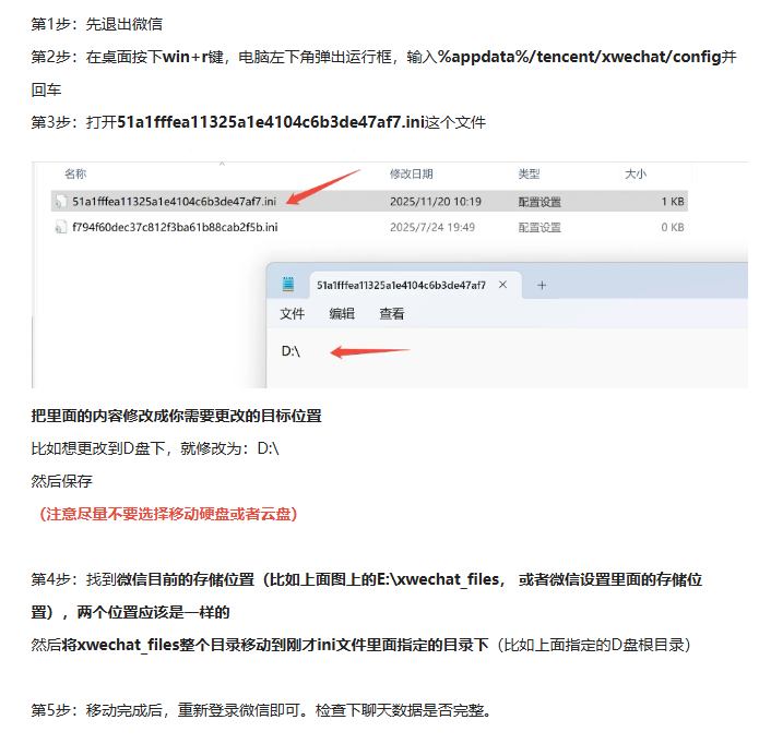 E:\xwechat_files)。 - 将该目录下的 整个文件夹 整体复制/移动到你在上一步中新设定的目标位置(如