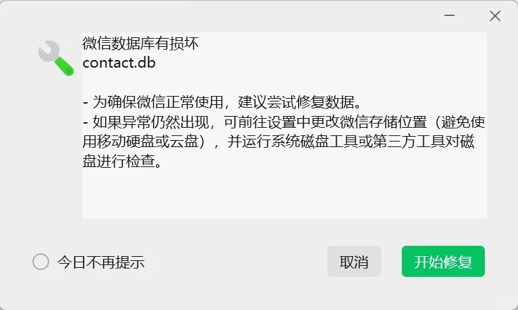 - 严重故障: 提示“微信数据库有损坏 (contact.db)”,甚至导致界面一片空白无法使用。