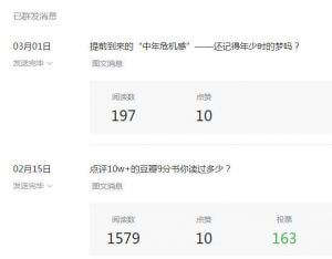 说点题外话,“豆瓣9分书”那篇之所以找朋友求转发,一方面是让朋友们知道自己开始写公号了,感兴趣的可以关注一下,另一方面觉得这篇还有点实用价值,推荐给大家也不算硬推。 当时推的时候就想好了,信用不能乱透支的,给别人添麻烦,替公号“刷脸”就这么一回,再者自己脸皮本来就薄,经不起刷,容易露骨…… 可万没想到的是,就这么一回还被不明不白的“潜规则”了,不开心~