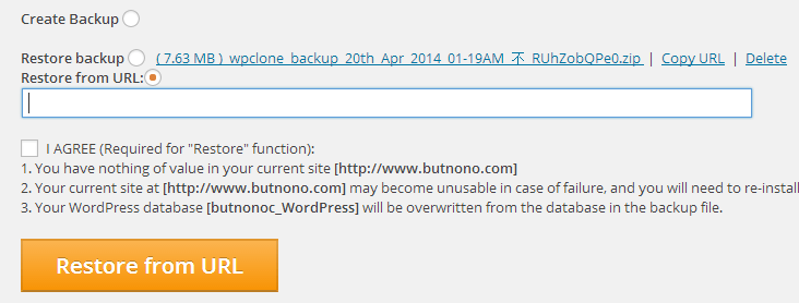 2. 在新wordpress博客安装WP Clone插件,把剪贴板里的URL粘贴过来,点击“Restore from URL”,钩选“I AGREE”;